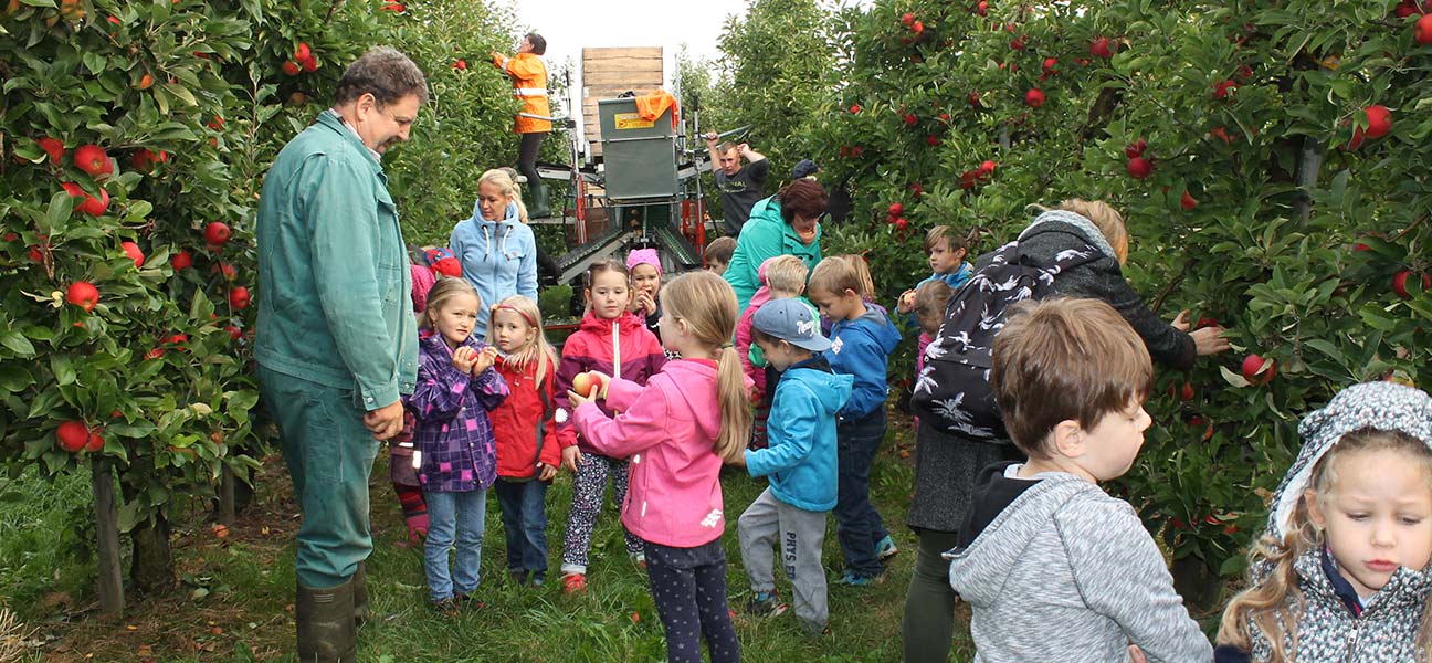 In der Erntezeit bieten wir für Vorschulklassen Rundfahrten durch die Apfelplantage an, wo jedes Kind „selber einen Apfel Pflücken darf“ und etwas über die Apfelernte, Lagerung und Sortierung lernt.